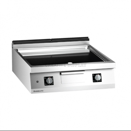 Griddle made of AISI 304 stainless steel, 20/10 mm thickness top. Cooking plate made in Fe510D steel with hard chromium surface treatment. Delivered with: plate plug. Heating by two independent burner groups controlled by modulating thermostat valve, safety thermostat. Working temperature (min-max): 100-280C.